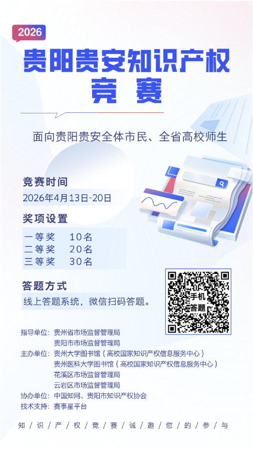 贵阳贵安知识产权竞赛活动重磅来袭!无论你是高校学子、职场创客,还是知识爱好者,这里都有一场脑力激荡的盛宴等你加入!通过趣味答题,轻松掌握专利、商标、著作权等核心知识,更有机会赢取文创大礼包!