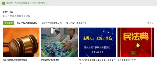 内容:通过中国知识产权远程教育平台贵州医科大学分站开设《专利信息中法律信息的内涵》、《仿制药生产相关法规》、《知识产权信息传播利用和信息公共服务产品》、《民法典中的知识产权》等相关课程。