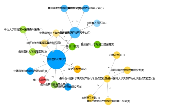 除校内合作申请外,我校与校外机构合作申请专利为22项,合作对象有高校、医院、科研机构及企业等(见图5)。其中贵州医科大学合作申请对象主要有中国科学院上海药物研究所(2项)、贵州大学(2项)、昆明医科大学(2项)、华中农业大学(1项)、中国科学院地球化学研究所(1项)等高校及科研机构,此外,还与贵州贵研科技有限公司(2项)、贵州瑞和制药有限公司(1项)等企业合作申请专利3项。贵州省天然产物研究中心(原贵州省中国科学院天然产物化学重点实验室(贵州医科大学天然产物化学重点实验室))的合作申请对象主要有贵州省人民医院(3项),以及贵州威凌生物科技有限公司(1项)、瓮安县文鸿特色农业有限公司(1项)、贵阳倍隆生物科技有限公司(1项)、贵州金蟾大山生物科技有限责任公司(1项)等贵州本土企业。