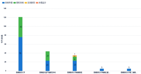 目前,我校拥有贵州省天然产物研究中心(原贵州省中国科学院天然产物化学重点实验室(贵州医科大学天然产物化学重点实验室),以下简称“天产中心”),以及贵州医科大学附属医院、贵州医科大学附属口腔医院、贵州医科大学第二附属医院、贵州医科大学第三附属医院4个直属附属机构。我校及直属附属机构下半年公开专利中,申请(专利权)人为贵州医科大学的有121项,均为发明专利,其中授权45项,申请76项;申请(专利权)人为贵州省天然产物研究中心的有44项,均为发明专利;申请(专利权)人为贵州医科大学附属医院的共35项(授权发明9项,发明申请23项,实用新型2项,外观设计1项);贵州医科大学附属口腔医院、贵州医科大学第二附属医院各有5项,且均为发明专利申请,贵州医科大学第三附属医院未见有公开专利。见图2 。