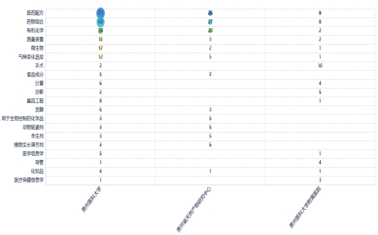 贵州医科大学、贵州省天然产物研究中心及贵州医科大学附属医院专利的应用领域分布见图7。可看出贵州医科大学及贵州省天然产物研究中心专利应用领域分布排名前三位的均为医药配方、药物组合及有机化学。此外,贵州医科大学在微生物(17项)、测量装置(15项)、气候变化适应(12项)、基因工程(9项)等领域分布的专利较多;贵州省天然产物研究中心在食品成分(7项)、用于生物控制的化学品(5项)、动物驱避剂(5项)、杀生剂(5项)、植物生长调节剂(5项)等领域分布较多;贵州医科大学附属医院专利应用领域主要为手术(10项)、医药配方(9项)、药物组合(8项)及诊断(5项)等。