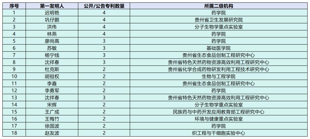 因无其他直属附属机构的人员信息,本次第一发明人统计仅限于申请人为“贵州医科大学”的发明专利,不包含天产中心及直属附属机构。贵州医科大学2025年下半年公开/公告的发明专利数量≥2件的第一发明人有18名,其公开/公告的数量及所属二级机构见表1。其中,公开/公告4项的第一发明人有迟明艳、巩仔鹏、洪伟及林燕,公开/公告3项的第一发明人有廖尚高、苏敏、杨宁线及沈祥春。